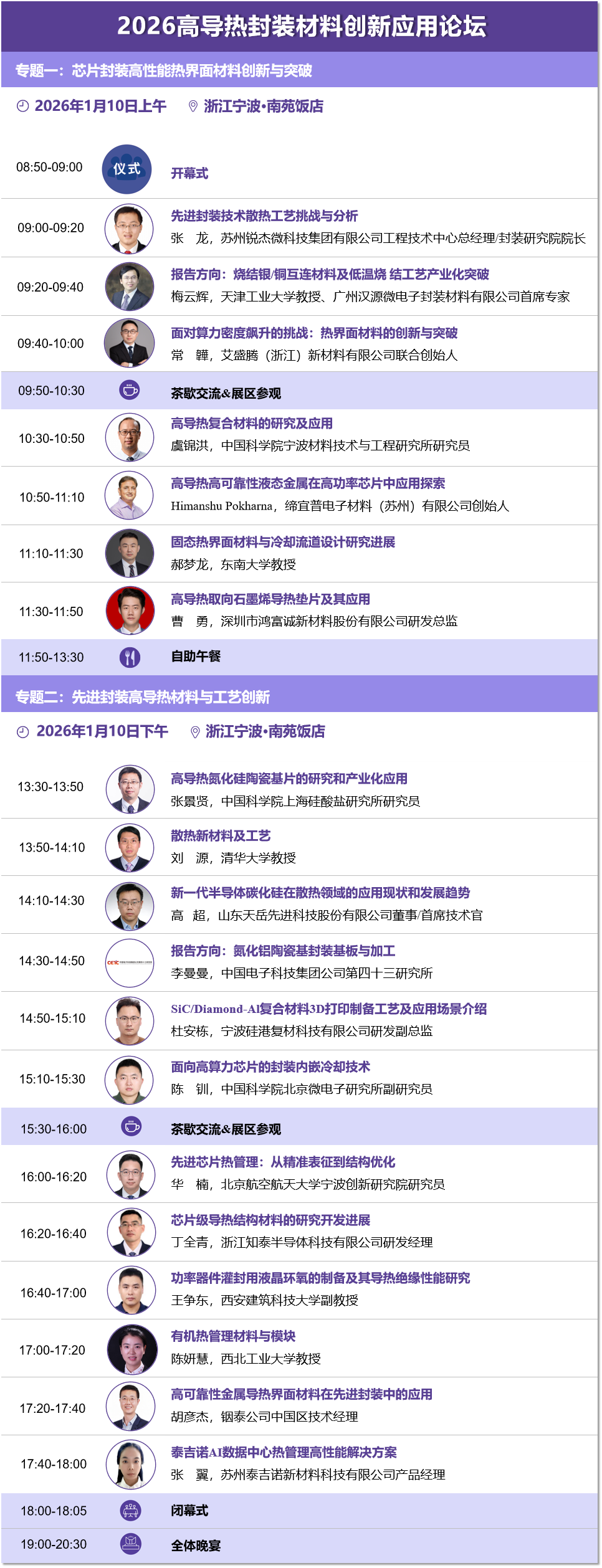 19家单位共探封装散热之道:锐杰微、天岳先进、铟泰、鸿富诚、泰吉诺、艾盛腾、宁波硅港复材、缔宜普、知泰科技、中电科43所、中科院微电子研究所、中科院宁波材料技术与工程研究所、中科院上海硅酸盐研究所、清华大学、西北工业大学、北航宁波创新研究院、东南大学、天津工业大学、西安建筑科技大学。